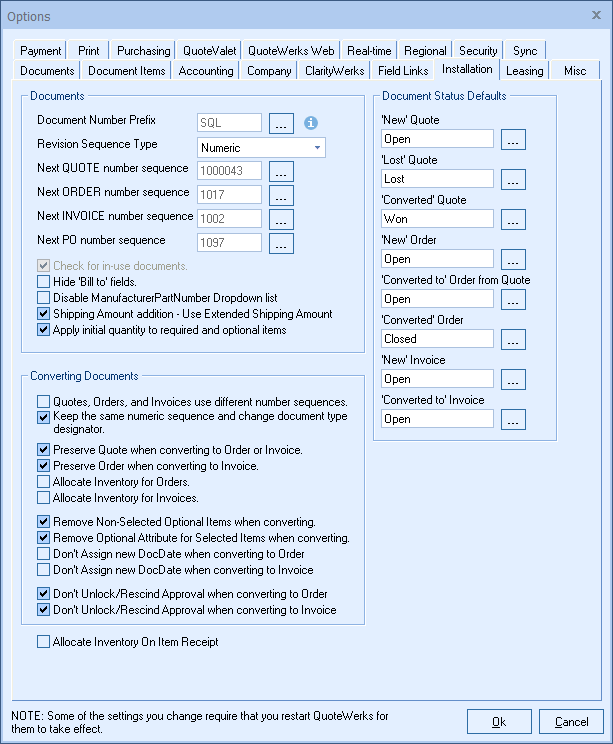 You can set each of the options under the Installation tab described above in different combinations. To help you understand how these options work together, we’ve put together a set of scenarios illustrating the starting quote number and resulting order number (when converting a quote to an order) based on different option combinations.