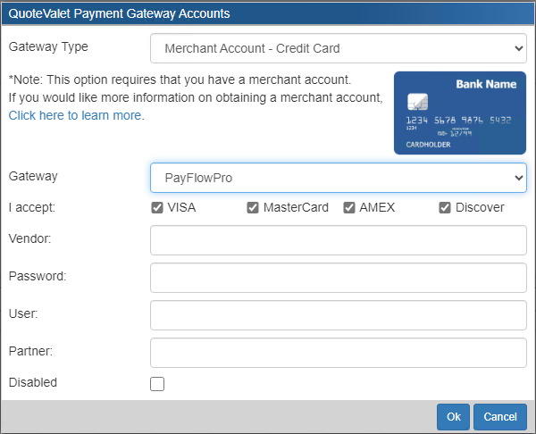 This topic covers how to set up QuoteValet payment processing to work with PayFlowPro. To set up the integration, you will need 4 required pieces of information.