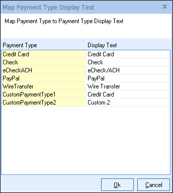 The [Map Payment Type Display Text] button enables users to set the text that will be displayed on the payment option. This is the default text that will be used when you add a new payment option manually on the Sale Info tab. You can manually type into the display text field to edit as needed.