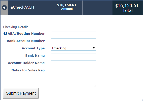 •ECheck: When this option is selected the customer will be able to enter in the checking information to submit payment via ACH. ACH must be setup in the payment processing tab in QuoteValet and your payment gateway must support this payment option for it to collect the payment.