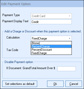 Each payment option includes the ability to add a surcharge, discount, and to disable the payment if the document total is over a certain amount.