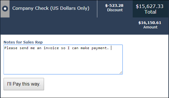 •Wire Transfer: This option would enable the customer to notify the sales rep they intend to pay by wire transfer. They can even post a note about when they are submitting payment or request for an invoice to start the process.