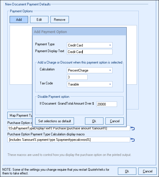 The [Set selections as default] button is a great way to save the default settings for a specific payment option. If you add a payment type manually for another quote down the road on the Sale Info tab, it will use the settings set here. For example, if you setup the Credit Card payment option, then click on the [Set selections as default] anytime you add a credit card payment option on the Sale Info tab, it will default to whatever settings are set here.
