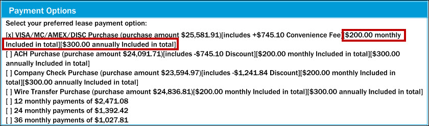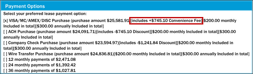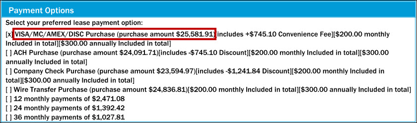 This macro displays the text on the layouts for the non-lease payment options (Credit Card, Check, ACH, etc.). The default text will look similar to this: Credit Card Purchase (purchase amount $42,269.34) if left as default. Users can change this text to anything they'd like to customize the upfront or cash price for when lease items may be present. It also provides more flexibility to not show the cash price as a purchase option.