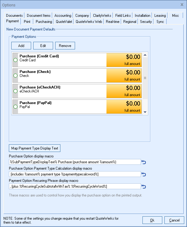 Clicking on the [Add] button will bring up the Add Payment Option window. In this window you can choose to add the following type of payment options as defaults for new quotes created in QuoteWerks: