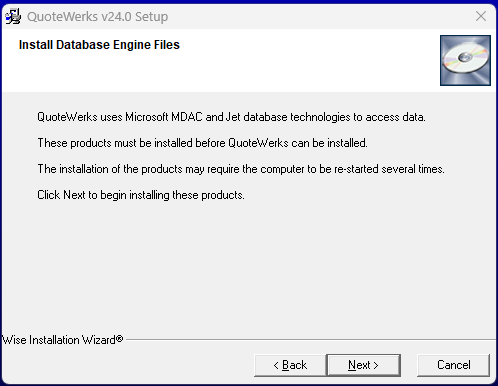 Step 4: Starting with 4.0, QuoteWerks uses Microsoft MDAC and Jet database technologies to access data. As a result, these products must be installed. The QuoteWerks setup program will install these for you. This may require a reboot during installation.