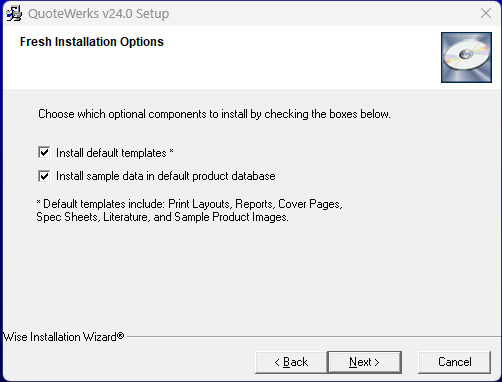 Whenever QuoteWerks is installed, a default product database is also installed. Choose this option if you’d like this sample data included in your default product database.