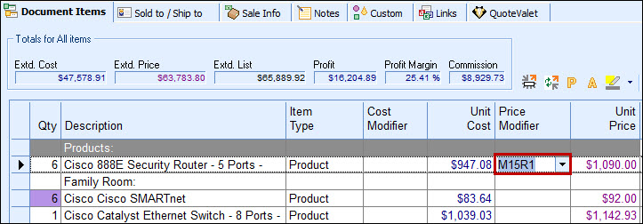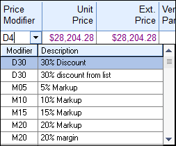 QuoteWerks uses price modifier codes to represent different pricing methods that determine the customer price of the item that you are selling. You can use a different price modifier code for each line item on the quote, and you can adjust them “on-the-fly”. When in the Price Modifier column, there is a drop-down box of price-modifier codes that have been set up. You can either choose from this list or type in a price modifier manually. The list of price modifier codes in the drop-down box is maintained under the Utilities -> Price Modifier Maintenance... menu.