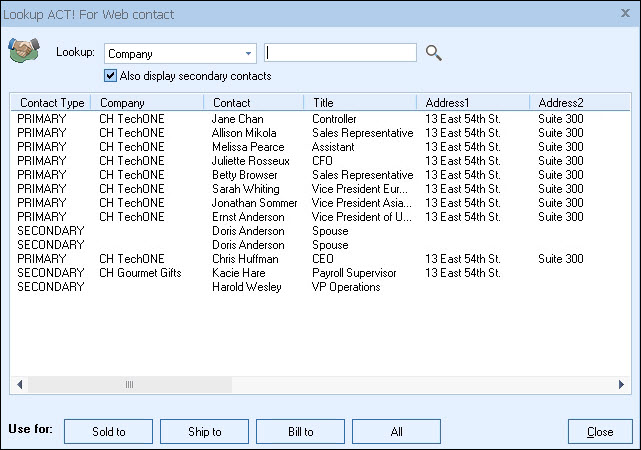 Once you have found the record you are looking for, select the contact (or company) and click on the [Sold To] button to use this contact for the Sold to information. You can also select a contact and click on the [Ship To] button to use this contact for the Ship to information or you can click on the [Bill To] button to use this contact for the Bill to information. When you are finished selecting contacts, click on the [Close] button. You will be returned to the Sold to/Ship to tab and the selected contacts will be pre-filled in the Sold to/Ship to/Bill to fields.