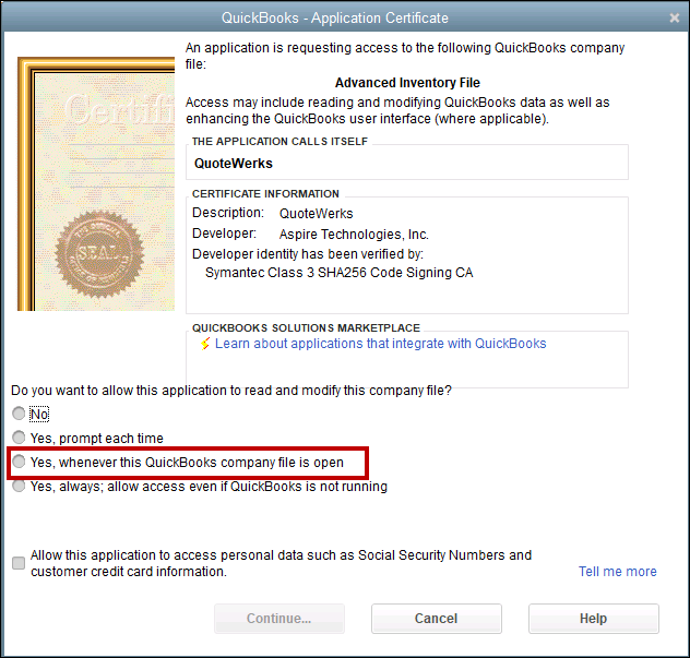 4. Click Continue. QuoteWerks should be able to communicate with QuickBooks now when the company file is open.