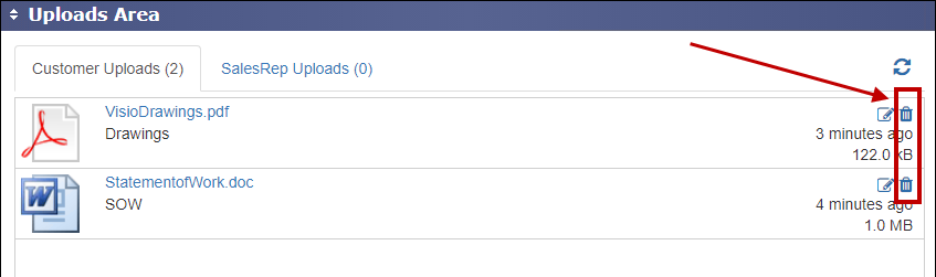 If a customer uploads a file, it can only be deleted by the sales rep. The sales rep will need to log in into the Sales Rep Facing Page and then click on the trash can icon next to the file to delete it from the Uploads Area.