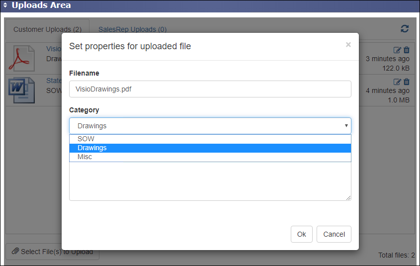 When a document is uploaded to either tab, the name of the document is defaulted to the file name. However, the client or sales rep can then edit the name once uploaded. Additionally, there is an option to specify a Category for the file to help with organization (such as SOW, Misc, etc). These categories are customizable on the QuoteValet Site Files tab in the QuoteValet Setup. You can also default the properties window to always open when a new file is uploaded in the setup. Additional notes can also be included to provide more detail or insight in the files that are being uploaded.