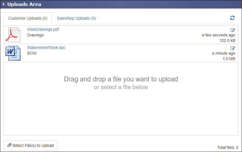 There are two tabs available on the Uploads Area Section, "Customer Uploads" and "Sales Rep Uploads". This lets the customer and sales rep upload and share documents with one another through the QuoteValet document instead of having to email the documents back and forth.
