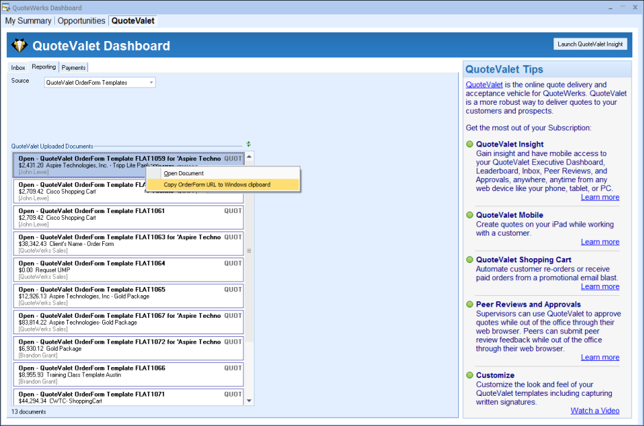 The reporting tab is also where users can view all of their existing templates for the QuoteValet Order Forms: