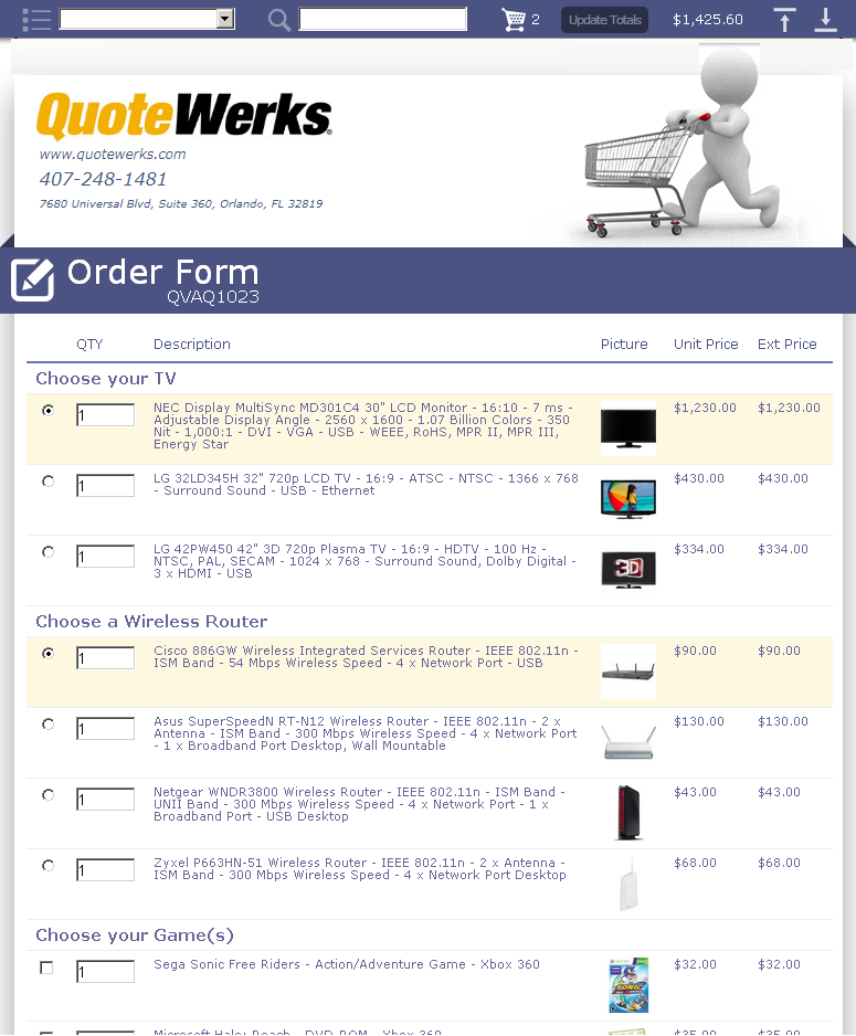 The QuoteValet Shopping Cart feature enables you to create online order forms for customers. You can create single or multiple order forms that can be used to automate customer re-orders or receive paid orders from a promotional email blast. The QuoteValet Shopping cart is included in the QuoteValet subscription.