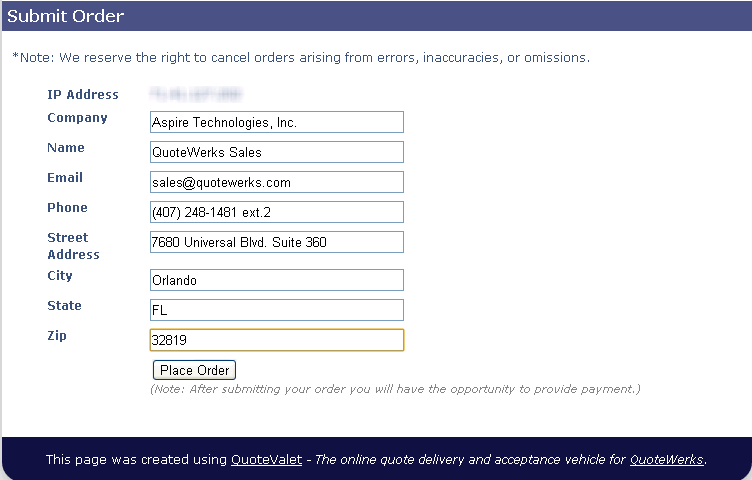 Click [Place Order] to finalize the order and submit it to QuoteValet. An email notification will be sent to the QuoteWerks user who created the order form in QuoteWerks.