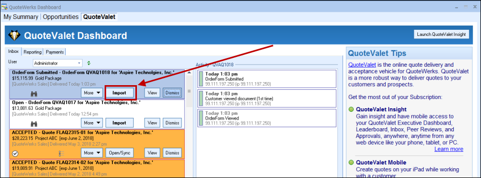 Once the order has been placed by your customer, you will receive an email notification and also a Dashboard notification. To process the users order you will need to import the order form. Click on your QuoteValet Dashboard icon to open the dashboard. You should see a new notification called "OrderForm Submitted...". If it is orange or green, it means the customer has accepted (orange) and possibly paid for the order already (green). To import this order form to see what the customer ordered, click on the Import button.