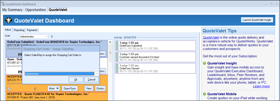 This will then prompt you to select the Sales Rep (QuoteWerks user) to assign this shopping cart order to. Select them from the drop-down list and then click [Ok].