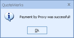 If a user makes a payment over the phone, by e-mail, or by sending a check you can use the Make Payment by Proxy button. This will let you update the QuoteValet document with the paid for amount. If you need to make partial payments, you can do that from this button as long as the deposit required for this payment allows it. The reference field enables users to put a reference point for how payment was received such as by phone or check. Once the payment has been submitted a confirmation will appear and the balance remaining will be updated. When making a QuoteValet Payment by Proxy you can specify the date the payment was received rather than the day you are entering the proxy payment in order to keep all payments and dates matching.