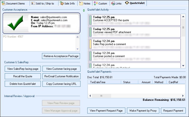 When the quote has been sent to the customer the QuoteWerks user can check the status of their document by opening the quote and clicking on the QuoteValet tab on the Quote Workbook.