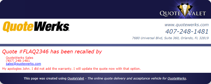 Recalling a quote that has yet to be accepted enables the QuoteWerks user to retrieve the quote before the client can accept the quote to make any adjustments when necessary. When a quote is recalled, the customer will not be able to view the quote. Instead, they will be redirected to a template that says, for example, "Sorry, this document has been recalled on 6/13/2018 at 9:45am by John Lewe."