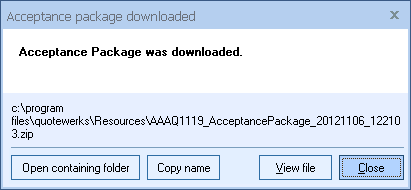 The acceptance package is all the information related to the quote including the acceptance details in case documentation of acceptance is needed later. It is downloaded to the Resources folder in the QuoteWerks directory into a .zip file. The acceptance package includes a copy of the original PDF document, a screenshot of the acceptance page from QuoteValet (included in PDF), and the Date/Time, Email address, IP Address, Name, and Signature information from the acceptance page as text files.