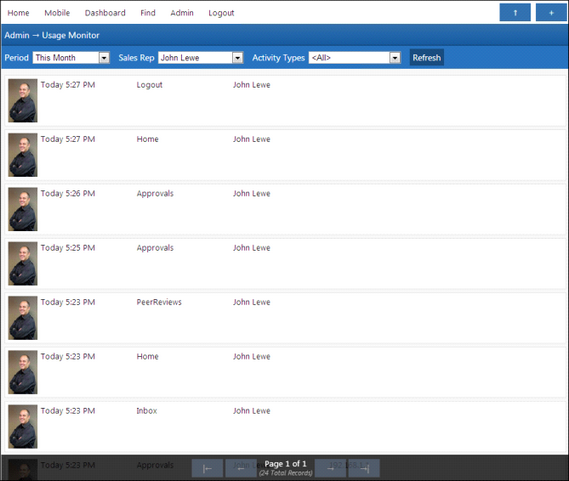 Admin-menu access requires master security rights. The Admin page enables you to check how your sales reps are using QuoteValet Insight. See when users log in and click links in QuoteValet Insight (Inbox, Peer Reviews, etc.). This is very useful in tracking users’ history, such as how often they’re using QuoteValet Insight and what features they’re accessing most frequently. Use the Period drop-down box to break your usage data down into different time periods (Today, This Week, This Month, etc.). Admins can also see any license allocation errors.