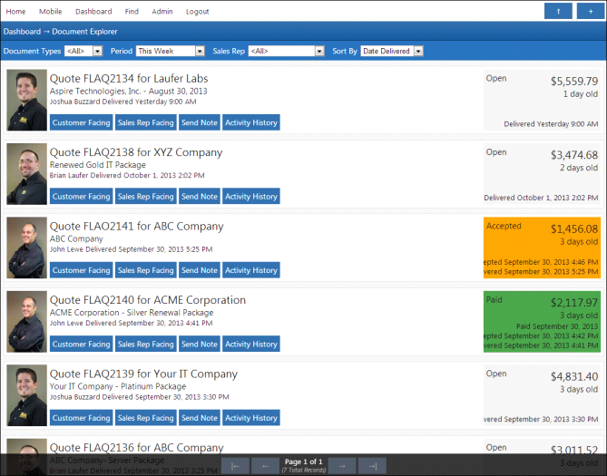 The Document Explorer allows you to locate documents based on type (quote or order), date range, and sales rep, as well as sort by date delivered/ accepted, amount of the document, or sales rep.