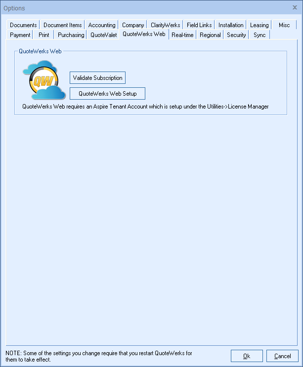 The options on this tab allow you to validate and sync your QuoteWerks Web Account settings. You will need to add your Tenant Account Name and Password to Utilities-> License Manager before you can setup QuoteWerks Web.