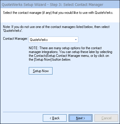 Step 3: QuoteWerks uses customer and prospect information stored in other software applications called contact managers. If you use one of the programs listed in the Contact Manager drop-down box, select it. If you store your list of customers and prospects in another form, select "QuoteWerks" or "(None)".