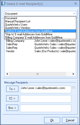 This will be a list of all email addresses associated with the GoldMine contact record that is linked to the Sold To fields in QuoteWerks.