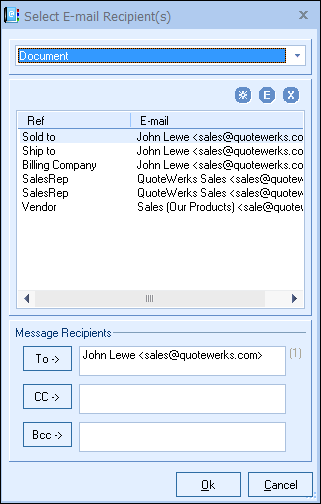 This selection displays a single list of all the email addresses related to the current open document. This includes the QuoteWerks users (on document), QuoteWerks Vendors (on document), Sold to (on document), Ship to (on document), Bill to (on document), and Sales Rep and Prepared by email addresses.