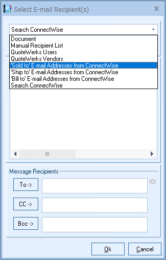 This will be a list of all email addresses associated with the MS CRM account or contact record that is linked to the Sold To fields in QuoteWerks. If linked to a MS CRM account record, all the email addresses associated with the account and all the email addresses associated with the contacts under this account will be displayed.