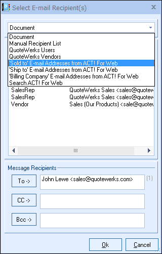 This will be a list of all email addresses associated with the ACT! for Web contact record that is linked to the Sold To fields in QuoteWerks.