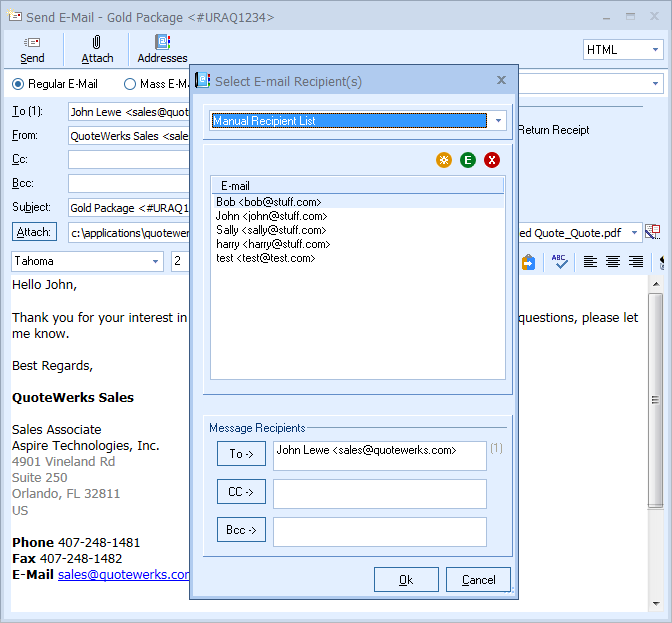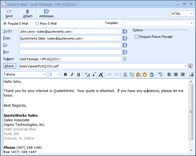 If you have setup QuoteWerks to send e-mails using Microsoft Outlook, the entire contents of the email including the to, cc, subject, message text, and attachments are logged and stored in Outlook’s history. Additionally, if you are using GoldMine, ACT!, Maximizer or MS CRM as your contact manager, the sent e-mail will be logged in the contact manager history. If you are using the QuoteWerks contact database, salesforce.com, SugarCRM, QuickBooks or Sage 50 (Peachtree) contact databases, or Saleslogix, the sent e-mail is not logged in the contact manager history.