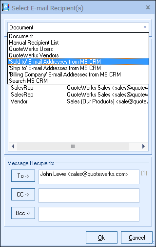This will be a list of all email addresses associated with the MS CRM account or contact record that is linked to the Ship To fields in QuoteWerks. If linked to a MS CRM account record, all the email addresses associated with the account and all the email addresses associated with the contacts under this account will be displayed.