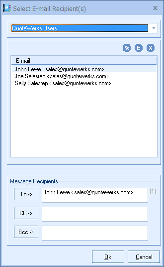 to the right of the To, From, Cc, and Bcc fields, you can choose one or more email addresses from several of the email address lists including QuoteWerks users and QuoteWerks Groups.