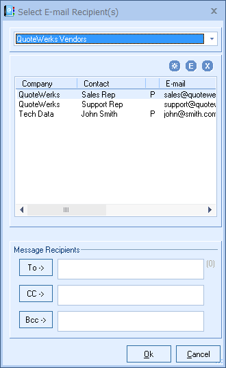 This selection displays a list of all the Vendors set up in QuoteWerks that have contacts with email addresses set up.