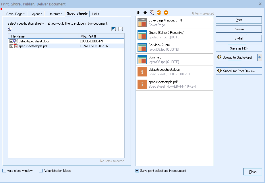 On this tab, you can choose to include any spec sheets associated with items in the document. Spec sheets can be formatted as RTF, Word, or PDF documents. It’s recommended that you save your spec sheets into the QuoteWerks\SPECS folder, however, you can also store them in another folder as long as it’s a folder that QuoteWerks can access.
