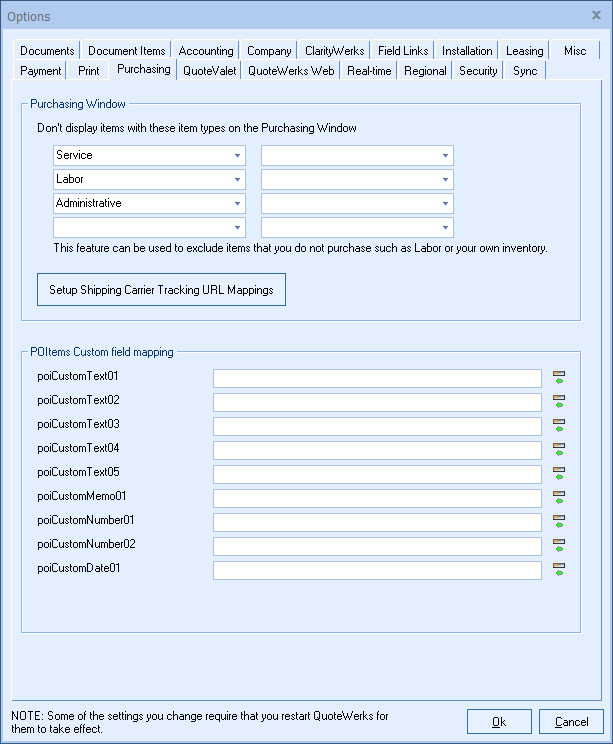 This site wide setting will exclude up to eight item types from displaying in the Purchasing tab of the purchasing window. This feature is used to exclude items that do no need a PO created for such as labor, service, or items from your own inventory.